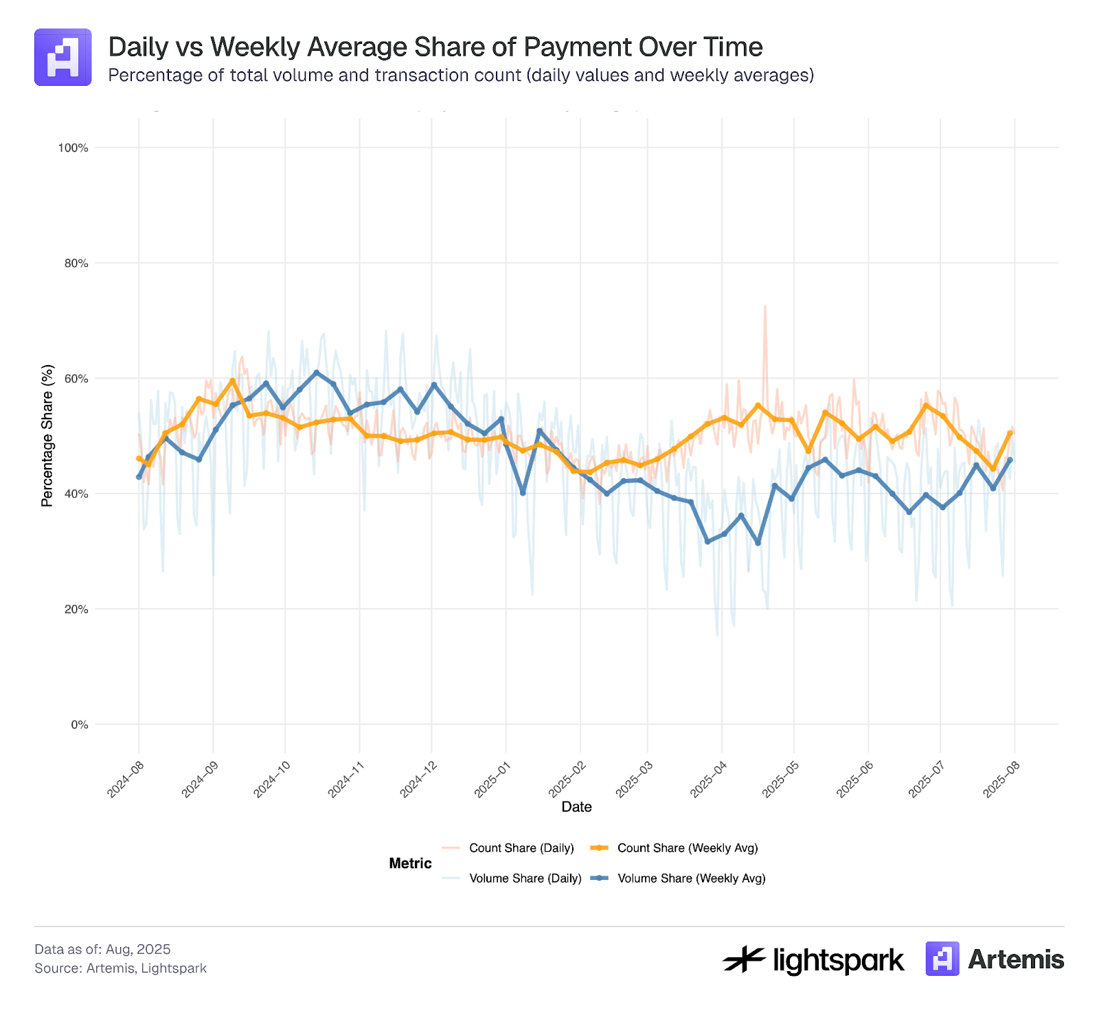 Table 2 and Figure 2 show that the split between payments (EOA-EOA) and smart contract transactions (DeFi) is roughly 50-50 by transaction count, with smart contract transactions accounting for 53.2% of volume. However, Figure 2 reveals that volume (total amount transferred) exhibits much greater fluctuation over time than transaction count, indicating that large EOA-EOA transfers—primarily from institutions—drive these fluctuations.