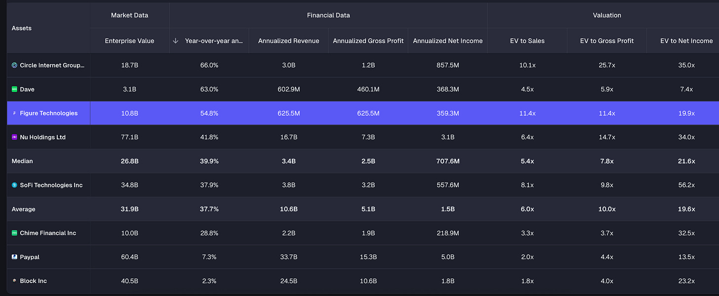 Comps Table: Figure is one of the fastest-growing companies in the crypto-adjacent world (note these metrics are using last quarter metrics and annualizing them)